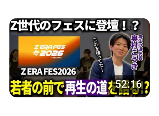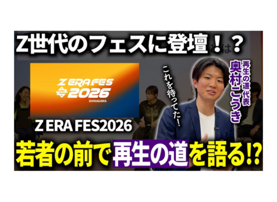 「Z ERA FES 2026」にご登壇いただいた再生の道代表の奥村こうきさんの運営する公式YouTubeチャンネル「再生の道」に登壇の様子がアップされました。 […]