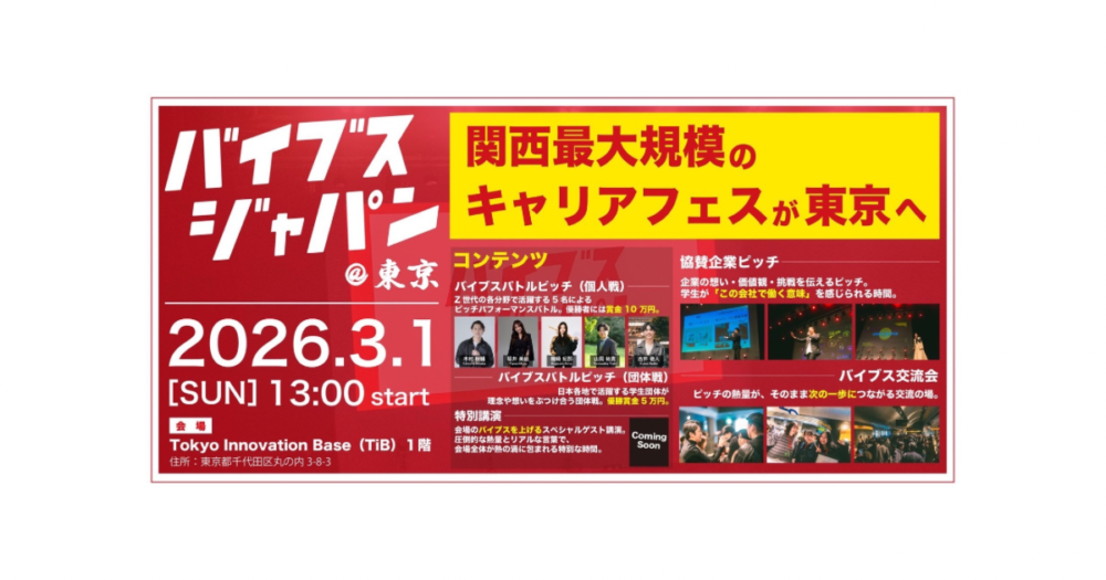 株式会社やるかやらんかは株式会社Neeew Localと共催で、2026年3月1日(日)、Tokyo Innovation Base(TiB)にて、関西最大規模のキャリアフェス【バイブスジャパン】を東京初開催いたします。次の一歩を踏み出す若者を増やしたい。そんな想いから、関西で育まれてきたこの熱量を、東京へと届けます。