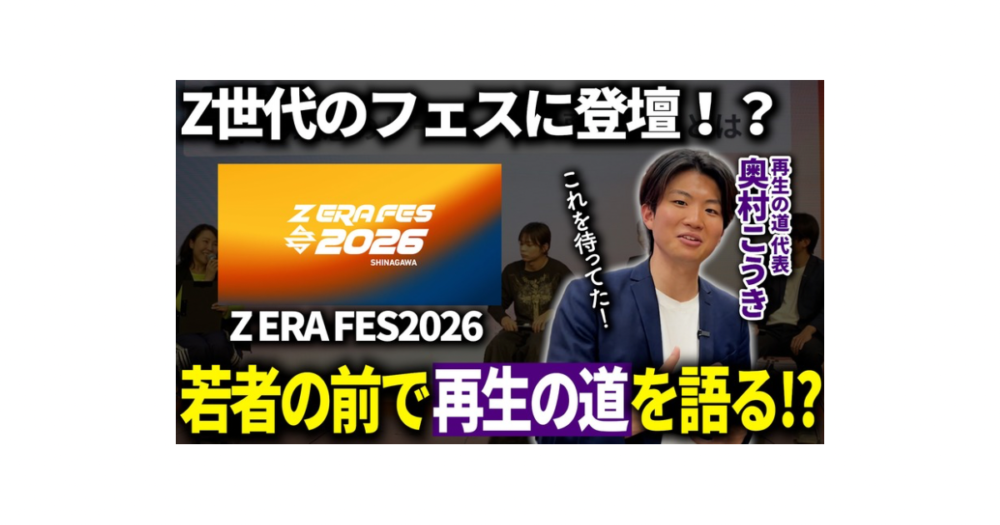 「Z ERA FES 2026」登壇者の奥村こうきさんのYouTubeに動画が公開されました! By Neeew Local2026年4月5日2026年4月8日メディア掲載 「Z ERA FES 2026」にご登壇いただいた再生の道代表の奥村こうきさんの運営する公式YouTubeチャンネル「再生の道」に登壇の様子がアップされました。 奥村さんの今後のご活躍が楽しみです。▼ぜひご覧ください!「【Z世代のフェス!?】若者に再生の道理念を語る!(代表 奥村こうき)」